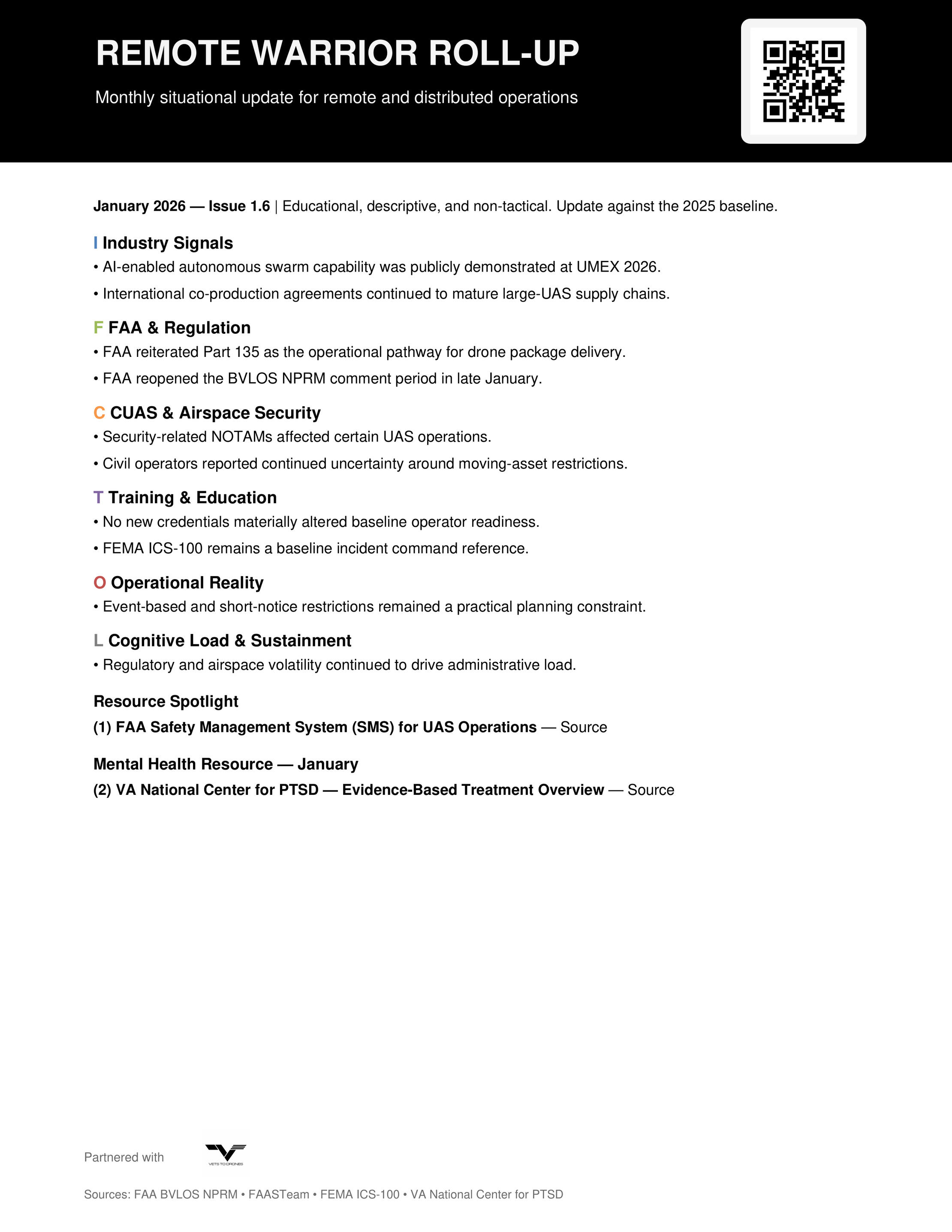 The Remote Warrior Roll-Up is a monthly, one-page situational awareness brief covering material developments across the RPA and UAS ecosystem. It tracks regulatory posture, industry signals, institutional adoption, airspace security, training realities, and operational sustainment—across both commercial and defense contexts—at a deliberately high level.Each issue is descriptive, not tactical, and is intended to support shared understanding rather than advocacy or instruction. The Year-in-Review Baseline establishes context; monthly issues update against it. All briefs are designed to stand alone and remain usable as reference artifacts over time.